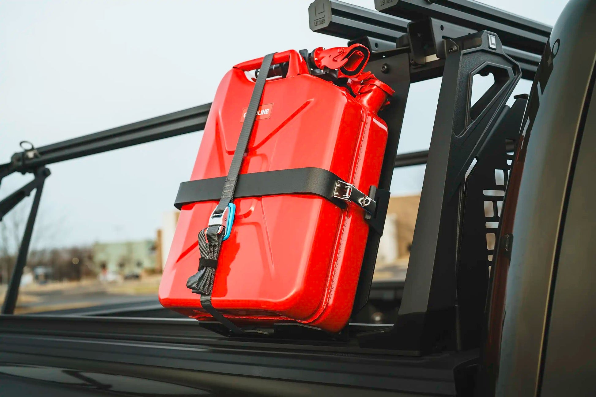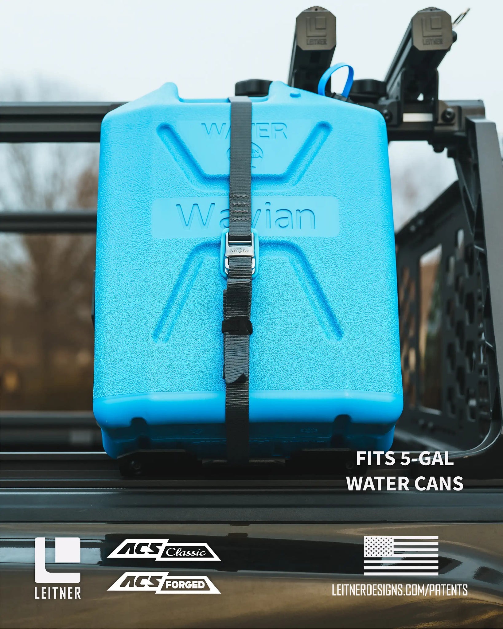 The Leitner Designs ACS Jerry Can Holder is designed to hold standard 20L water and fuel Jerry Cans manufactured by Wavian, as well as water cans manufactured by Scepter. This holder is designed specifically for the ACS Classic and ACS forged truck bed racks.