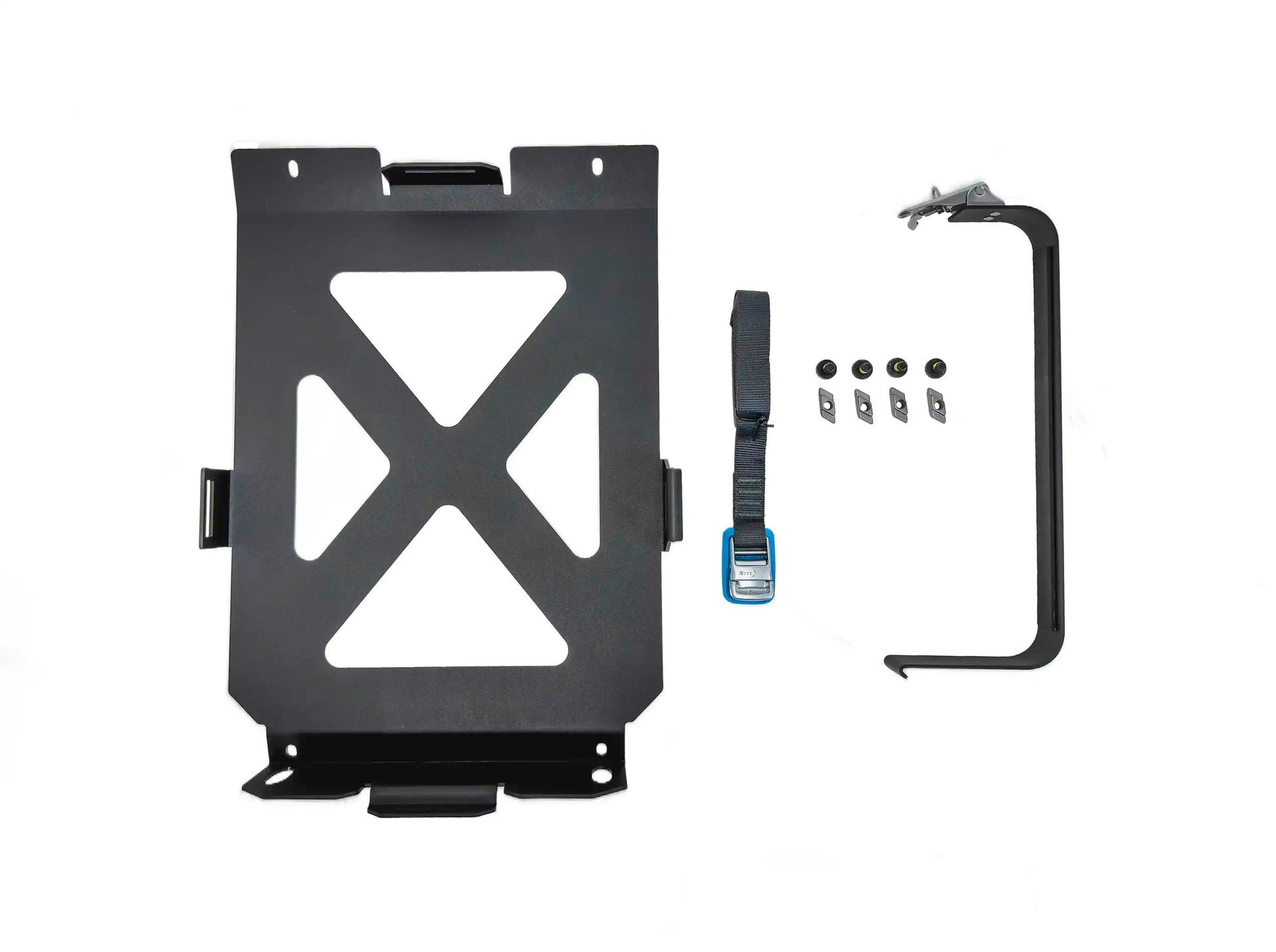 Each holder is manufactured from 1/8” steel. The stainless-steel over-center clamp has an eyelet for a padlock of your choice. We have included a 1-inch-wide Nite Ize Cam Jam tie-down strap for extra security off-road.